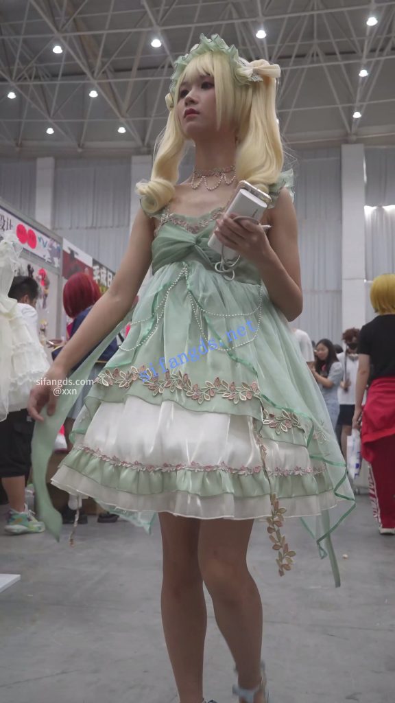 •  双马尾蕾丝裙美女,穿了裙撑裙子非常短,里面竟然无打底,浅黄内前后CD。