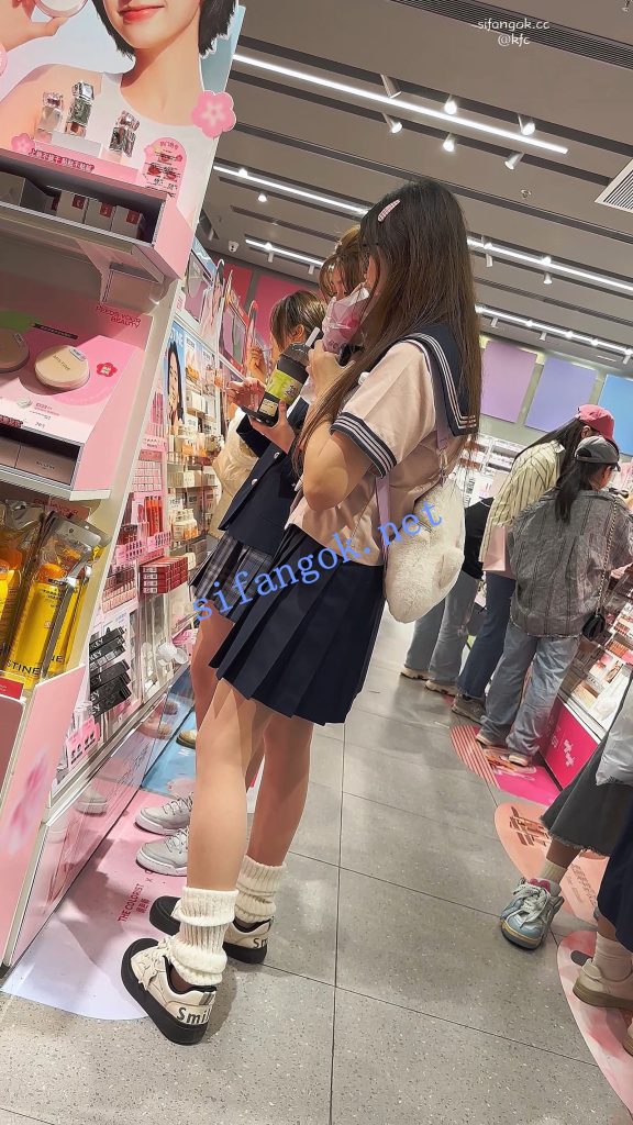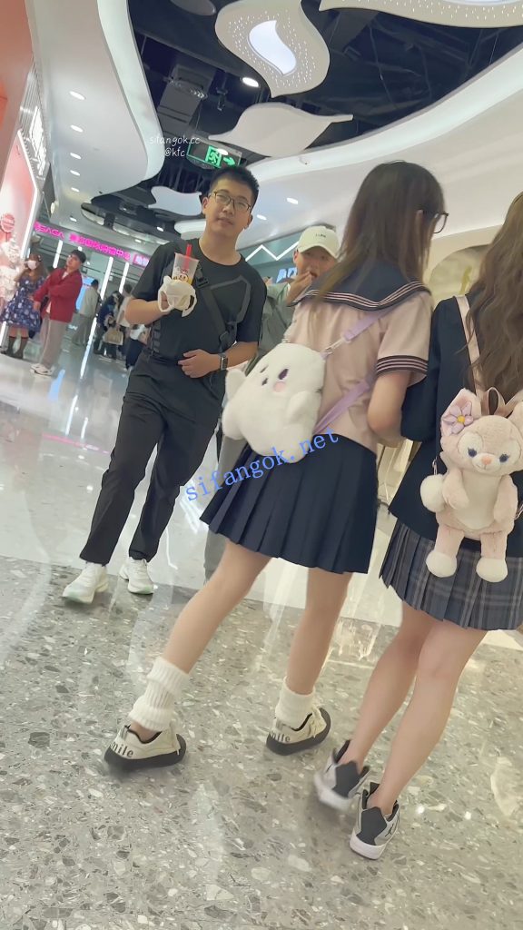 •  JK学生妹和闺蜜逛街·肉色丝袜灰色内内全夹进屁股里
